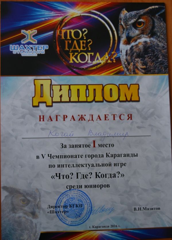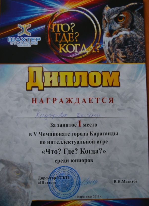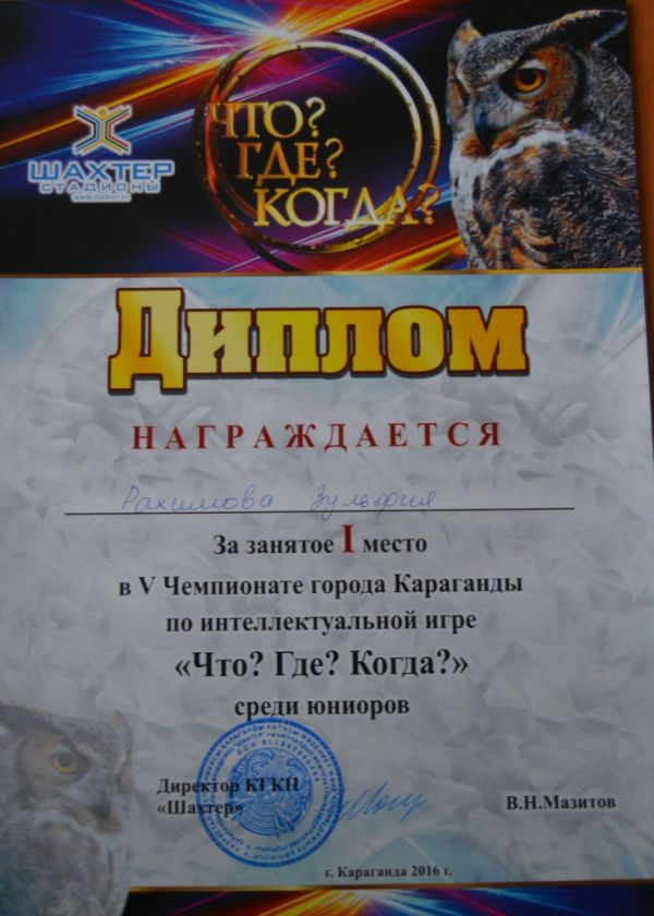 Командасын "Какао" жеңіспен, 5-ші Чемпионатына Қарағанды қаласының зияткерлік ойын "Не? Қайда? Қашан?" жасөспірімдер арасында! А. Рахимова Зюльфия болды үздік ойыншысы!