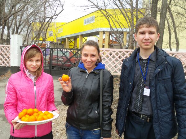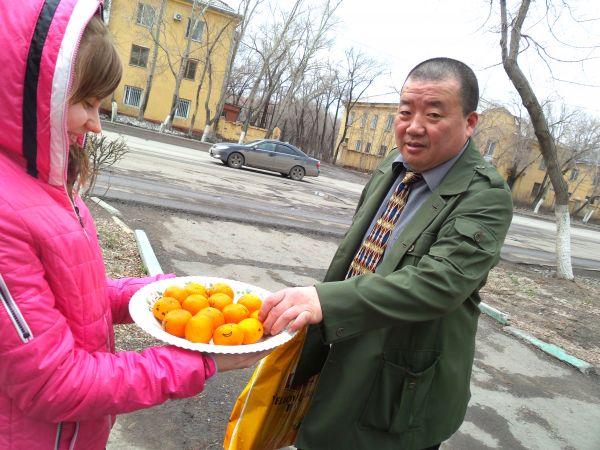 В рамках весенней недели добра, 9 "В" класс провел акцию "Дарим хорошее настроение". Лицеисты угощали друзей, учителей,прохожих мандаринами и дарили добрые пожелания.