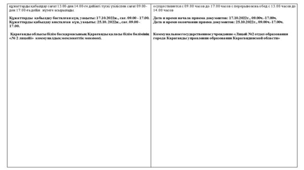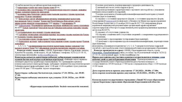 Қарағанды облысы білім басқармасының Қарағанды қаласы білім бөлімінің «№2 лицейі» коммуналдық мемлекеттік мекемесі азаматтық қызметкерлер лауазымдарының бос орындарына орналасуға конкурс…