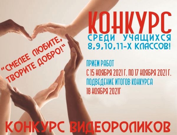 конкурс видеороликов на тему: «Смелее любите, творите добро!», приуроченный к празднованию Всемирного дня доброты (13 ноября) и Международного дня толерантности (16 ноября).