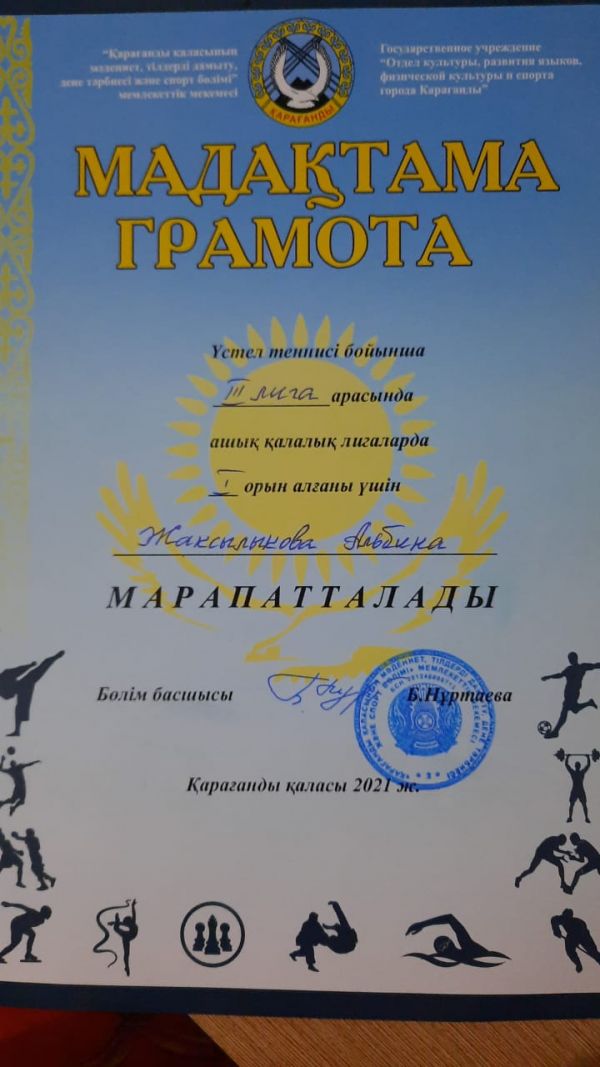 Үстел теннисі жарысында 1орын алған 9 "А" сынып оқушысы Жаксылыкова Альбина мадақтамен марапатталды.