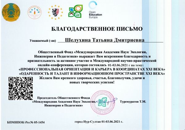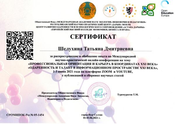 Т.Д. Шелухина Халықаралық ғылыми-практикалық конференцияға қатысып, ғылыми мақалалар жинағында өз тәжірибесін жинақтады.