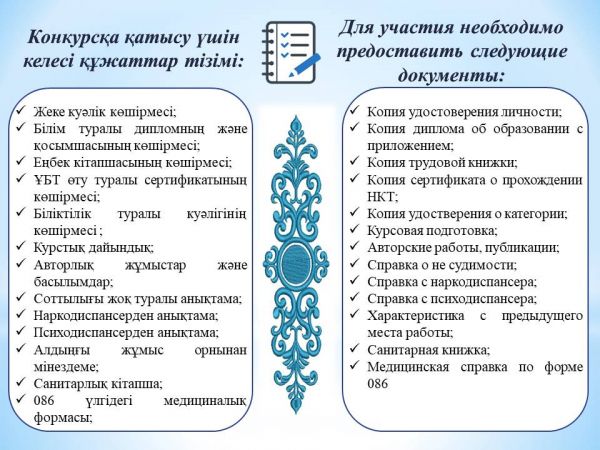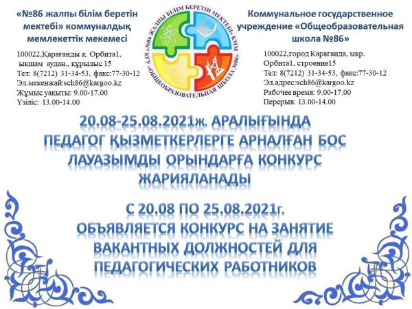 20.08-25.08.2021ж. аралығында Педагог қызметкерлерге арналған бос лауазымды орындарға құжаттар қабылданады
