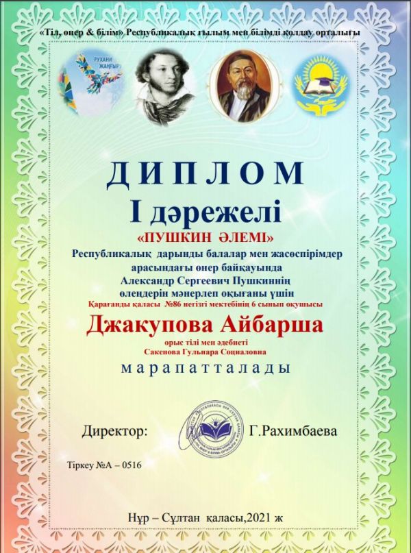 «Алтын қазына» көркем және сәндік-қолданбалы өнер бойынша балалар шығармашылығының облыстық көрме-байқауының облыстық кезеңіне қатысқаны үшін 10 «А» сынып оқушысы Оразбаева С…