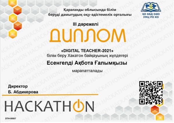 Қарағанды облысы білім беруді дамытудың оқу-әдістемелік орталығының ұйымдастыруымен 2021 жылдың 26-28 сәуір аралығында өткен «Digital teacher» білім беру Хакатонынан бас жүлдені алған ме…