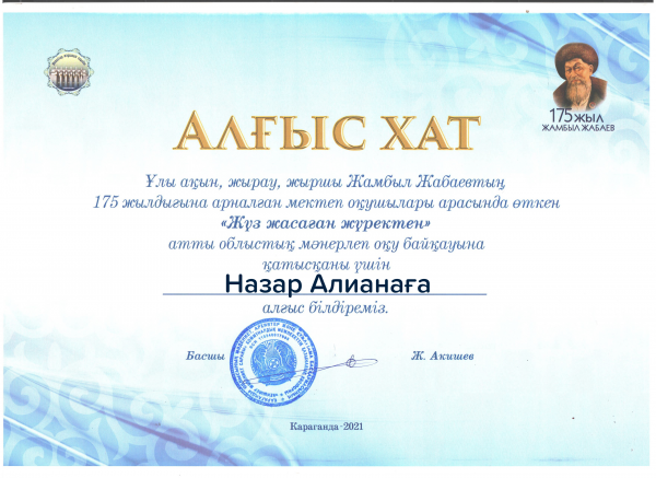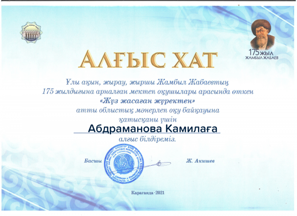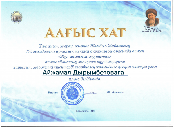В областном конкурсе чтецов «Жуз жасаған жүректен», в посвященном 175-летию со дня рождения великого поэта Жамбыла Жабаева Дырымбетова Айжамал Пердебаевна награждается благодарственным п…