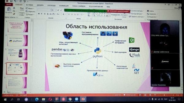 02.03.21 учитель информатики Турыбаева А.Е. провела открытый урок информатики в 11 классе на платформе ZOOM. Тема урока "Программирование на языке Python".
