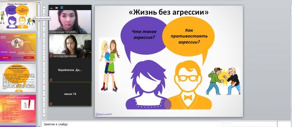 25.01.2021г психологом школы Магавьяновой К.С. была проведена онлайн-встреча с учащимися 7-х классов на тему: «Жизнь без агрессии и конфликтов».