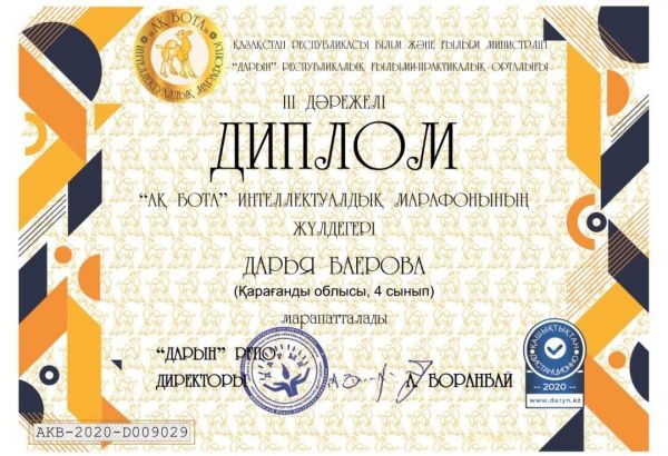 4 В сынып және 3 В сынып оқушылары (сынып жетекшісіТ.Д.Шелухина) "Ақбота" республикалық зияткерлік марафонының олимпиадасына қатысып жүлдеді орындарға ие болды. Құттықтаймыз!
