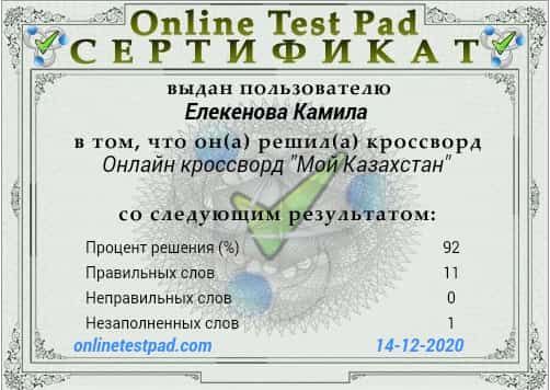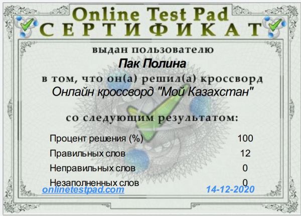 Тәуелсіздік күні қарсаңында 4 "Г" сынып оқушылары сынып жетекшісі Карп Елена Витальевнаның жетекшілігімен "Менің Қазақстаным" тақырыбында онлайн - кроссвордты шешуге қатысты