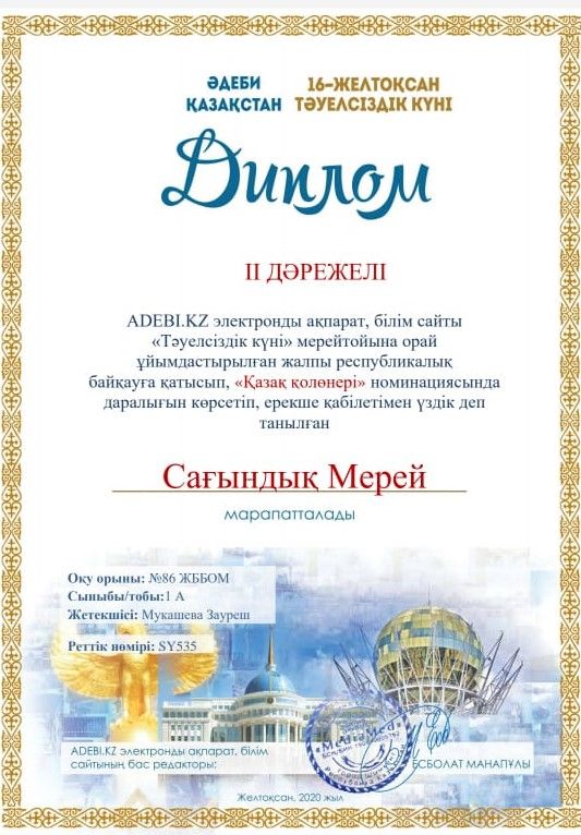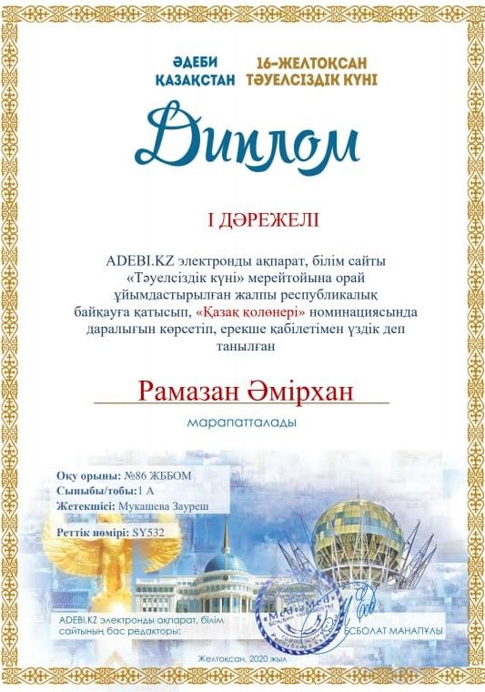 ADEBI.KZ электронды ақпарат ,білім сайты "Тәуелсіздік күні мерейтойына орай ұйымдастырылған жалпы республикалық байқауға қатысып,"Қазақ қолөнер" номинациясында даралығын көрсетіп, ере…