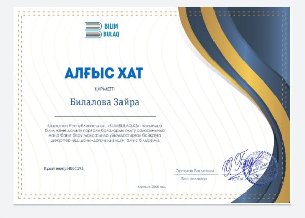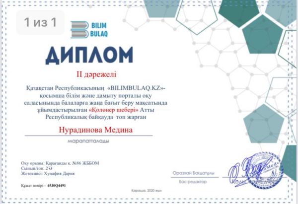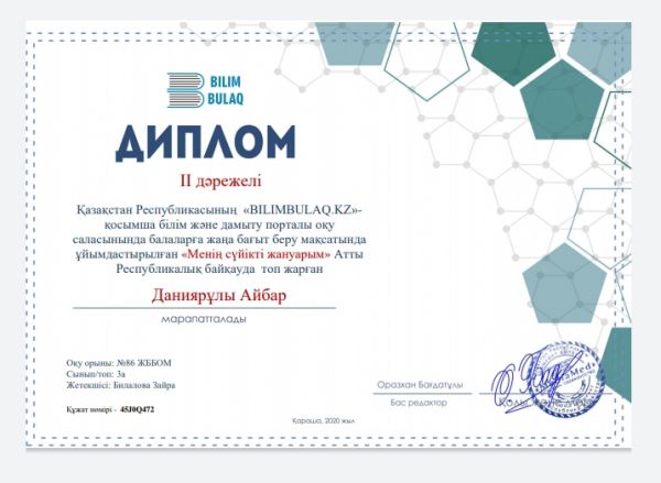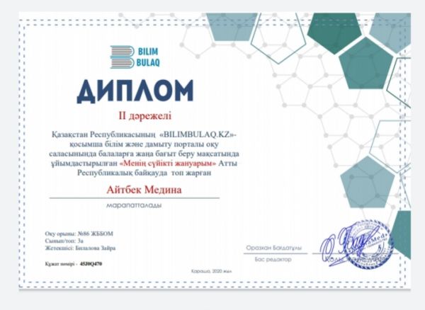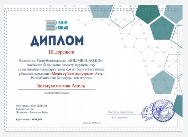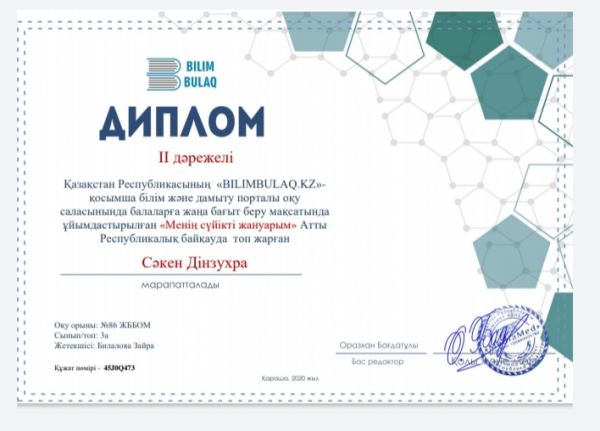 ҚР "BILIMBULAQ.KZ" қосымша білім және дамыту порталы оқыту саласында жаңа бағыт беру мақсатында ұйымдастырылған байқауда "Менің сүйікті жануарым" аталымы бойынша қатысып, топ жар…