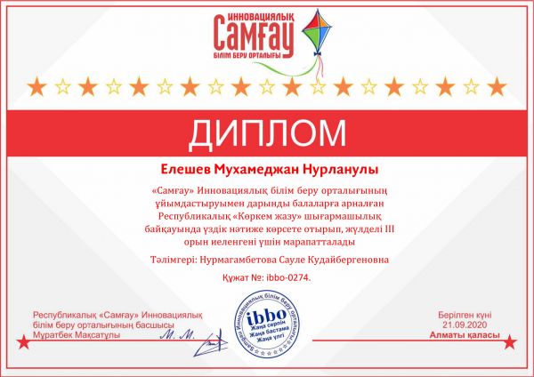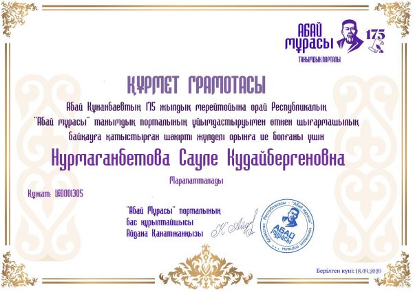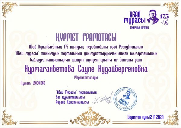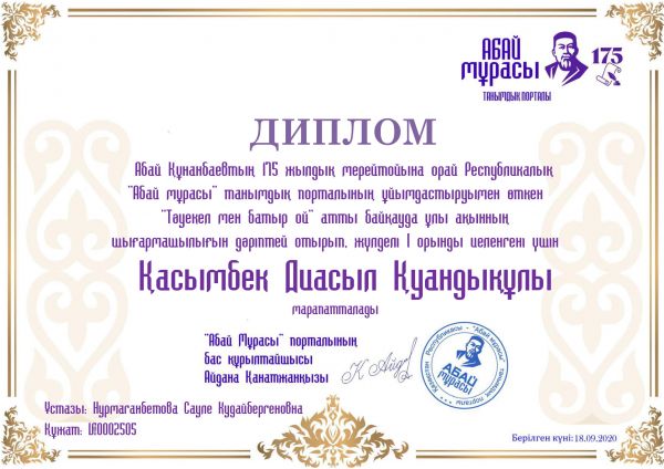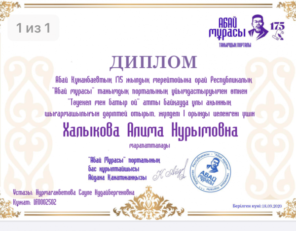 2А сынып оқушылары Халыкова Алима,Қасымбек Диасыл, Руфатұлы Абдуләлим Абай Құнанбаевтың 175 жылдық мерейтойына орай Республикалық «Абай мұрасы» байқауына қатысып, жүлделі &nb…