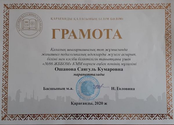Қалалық шығармашылық топ жұмысында жаңашыл педагогикалық идеяларды жүзеге асырып, білімдері мен кәсіби біліктіліктерін танытқандары үшін мектебіміздің дефектолог, логопед мұғалімі – Айтж…