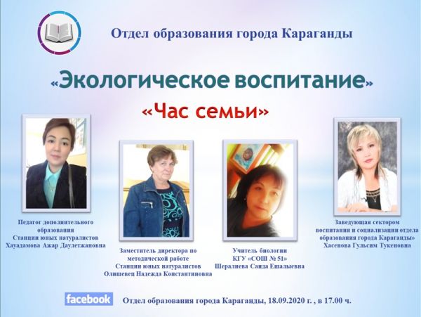 "Отбасы сағаты", "Еңбек тәрбиесі" тақырыбында "Қарағанды қаласының білім бөлімі" ММ-сiнiң Facebook ресми парақшасында 25.09.20ж сағат 17:00 де тiкелей эфир өтеді.