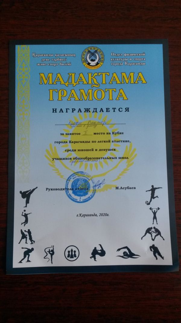 2020 жылдың 03 наурызында  жеңіл атлетикадан ер балалар арасында Қарағанды қаласының Кубогына арналған жарыста ұзындыққа секіруден Крафт Виктор 2-ші орын алды.