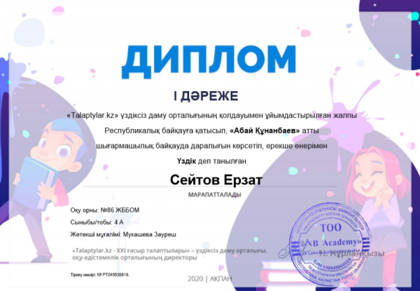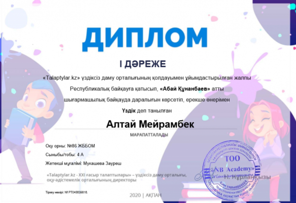 Үздіксіз даму орталығының қолдауымен ұйымдастырылған жалпы Республикалық байқауға қатысып, «Абай Құнанбаев» атты шығармашылық байқауда даралығын көрсетіп, ерекше өнерімен Үздік деп таныл…