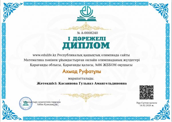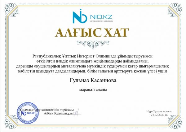 Республикалық Ұлттық Интернет Олимпиада ұйымдастыруымен өткізілген пәндік олимпиадаға жеңімпаздарды дайындағаны, дарынды оқушылардың ынталануына мүмкіндік тудырумен қатар шығармашылық қабілеті…