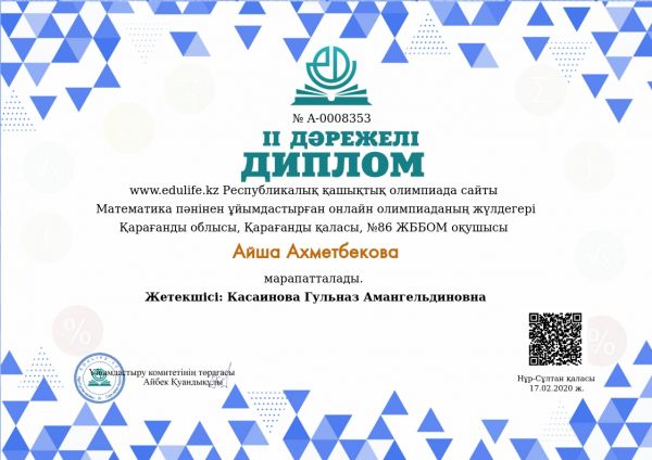 Республикалық қашықтық олимпиада сайты Математика пәнінен ұйымдастырған онлайн олимпиадаға № 86 ЖББОМ 2 «Ә» сынып білім алушылары белсенді қатысып І, ІІ, ІІІ дәрежелі дипломд…