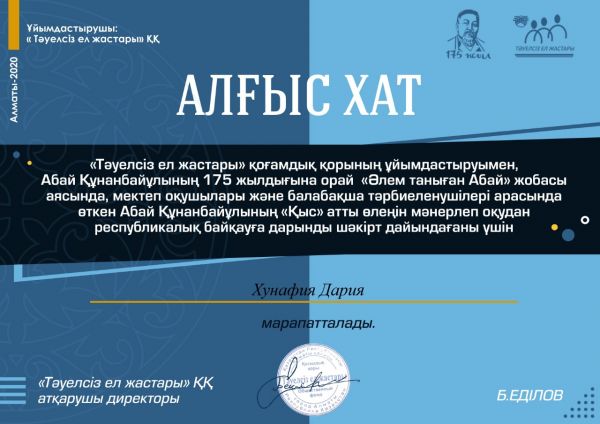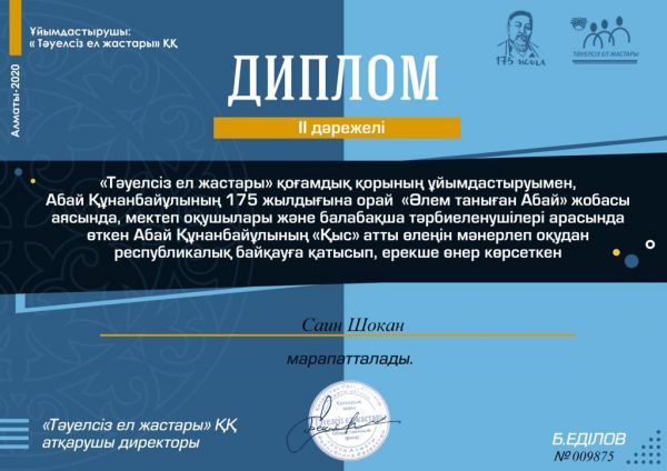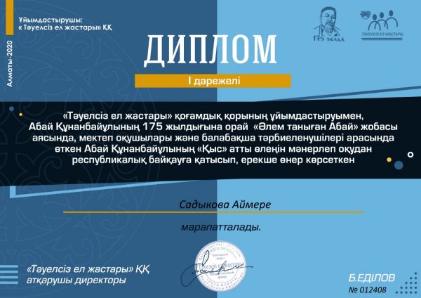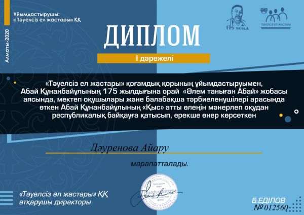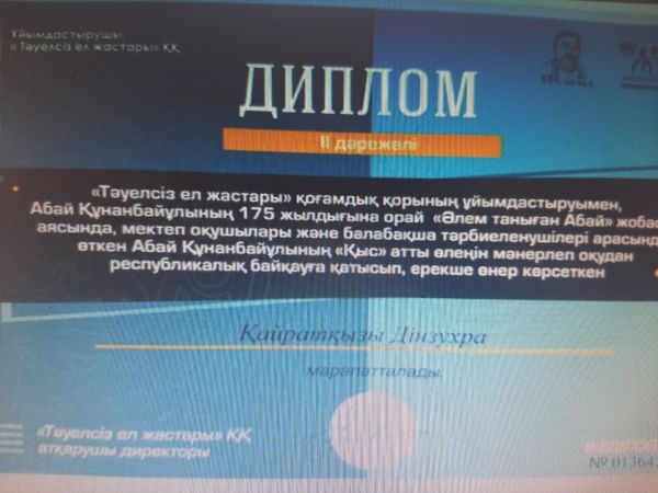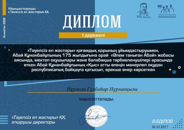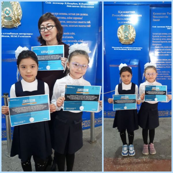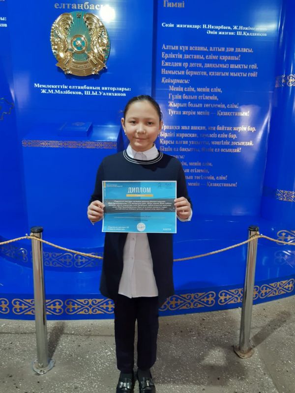 Абай Құнанбаевтың туғанына 175 жыл толуына орай «Қыс» өленін мәнерлеп, жатқа айту Республикалық сайысына қатысқан 4 «А» сынып оқушылары Назарбаева Асыл ІІ дәрежелі дипломмен…