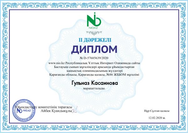 Бастауыш сынып мұғалімдері арасында ұйымдастырылған қашықтық олимпиаданың жүлдегері бастауыш сынып мұғалімі Касаинова Гульназ Амангельдиновна 2-дəрежелі дипломмен марапатталды.