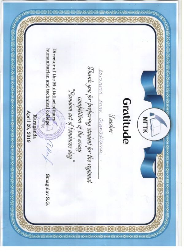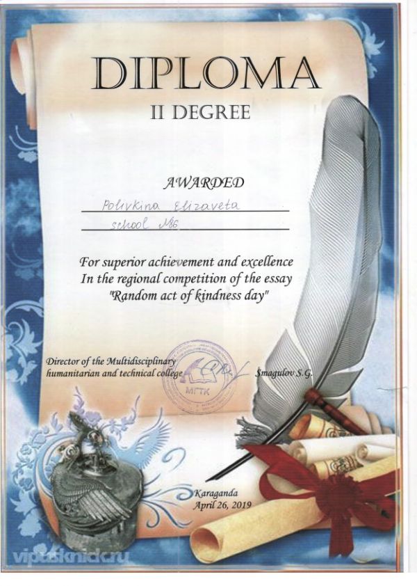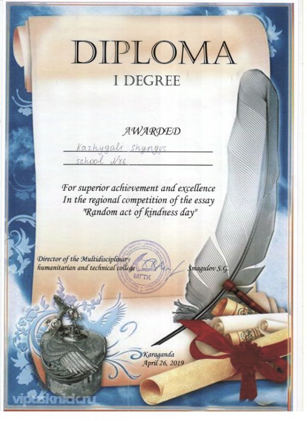 Учащиеся 11 Б класса приняли участие в городском конкурсе эссе на английском языке "День спонтанного проявления доброты" и заняли призовые места. 1 место -Кажыгали Шынгыс, 2 место -Поливки…