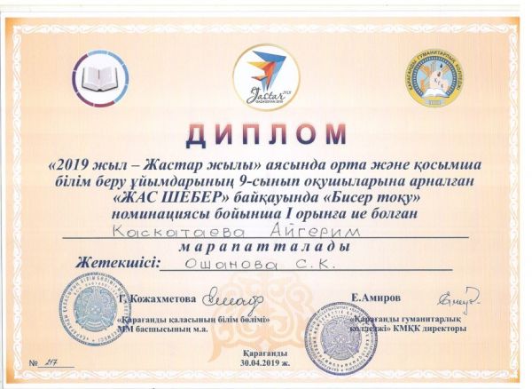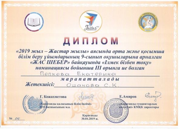 Поздравляем Попкову Екатерину за занятое ІІІ место в номинации "вязание крючком" в конкурсе "Юный мастер", подготовленном карагандинским гуманитарным колледже, Каскатаеву Айгерим…