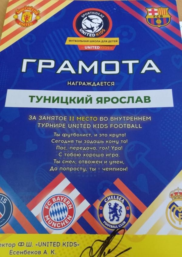 3 "Г" сынып оқушысы Туницкий Ярославты UNITED KIDS FOOTBALL ішкі турнирінде ІІ орын алғаны үшін құттықтаймыз.