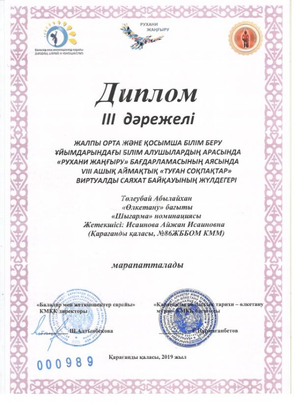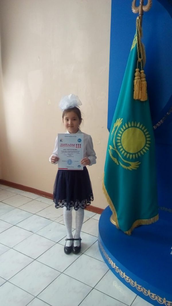 За успешное выступление вгимназии №39 им. Магжана Жумабаева нагородском конкурсе «МОЛОДЫЕ ИССЛЕДОВАТЕЛИ» среди учеников Толеу Айгуль ученица 3 «А»кла…
