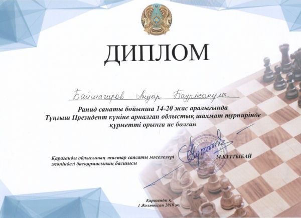 10 "Б" сынып оқушысы Байшагиров Ануар рапид санаты және блиц санаты бойынша Тұңғыш Президент күніне арналған облыстық шахмат турнирлерінде құрметті орынға ие болды.