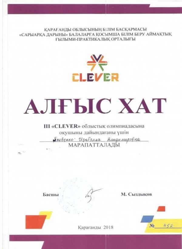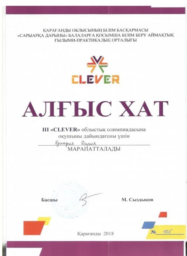 Дырымбетова Айжамал Пердебаевна, Хунафия Дария және Яковенко Изабэлла Владимировна ІІІ "Clever" облыстық олимпиадасына оқушыларды дайындағаны үшін алғыс хатпен марапатт…