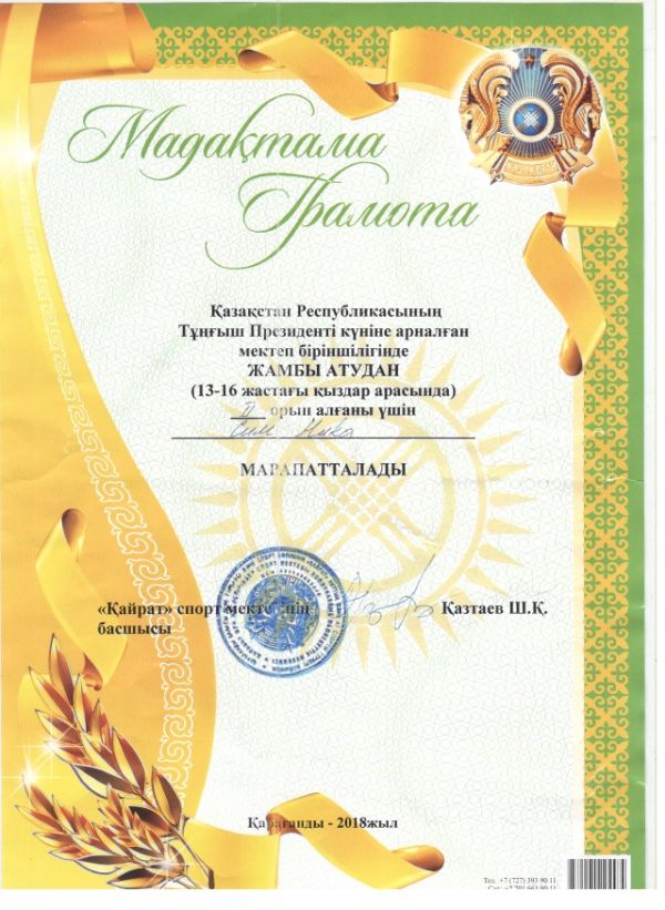 Қазақстан Республикасының Тұңғыш Президенті күніне арналған мектеп біріншілігінде жамбы атудан ІІ орын алған 6 "Б" сынып оқушысы Сим Ника мадақтамамен марапатталды.