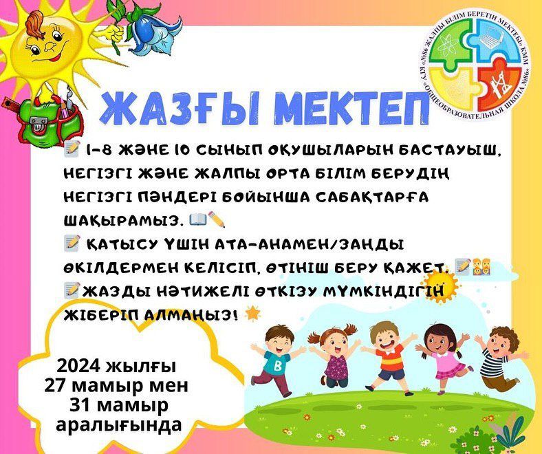 Жазғы мектеп 2024 жылғы 27 мамыр мен 31 мамыр аралығында және ағымдағы жылғы 26-30 тамыз аралығында жұмыс істейтін болады. Жазғы Мектепте сабаққа қатысу өтініштер негізінде ата-аналармен / заңды өкі…