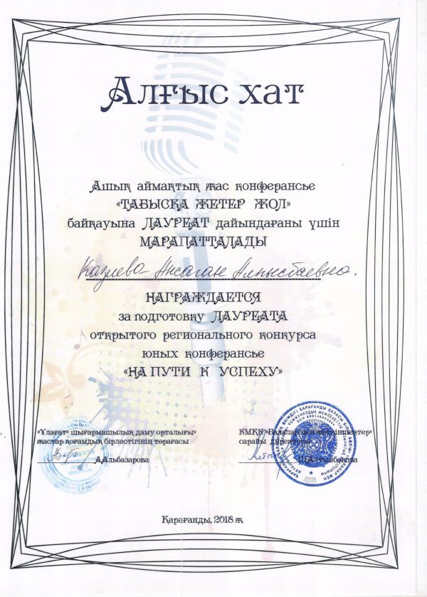 "Ұлағат" шығармашылық даму орталығының" жүргізуімен ұйымдастырған "Табысқа жетер жол" жас конференсье -- жүргізушілердің ашық аймақтық байқауына белсене қатысып III дәрежелі…