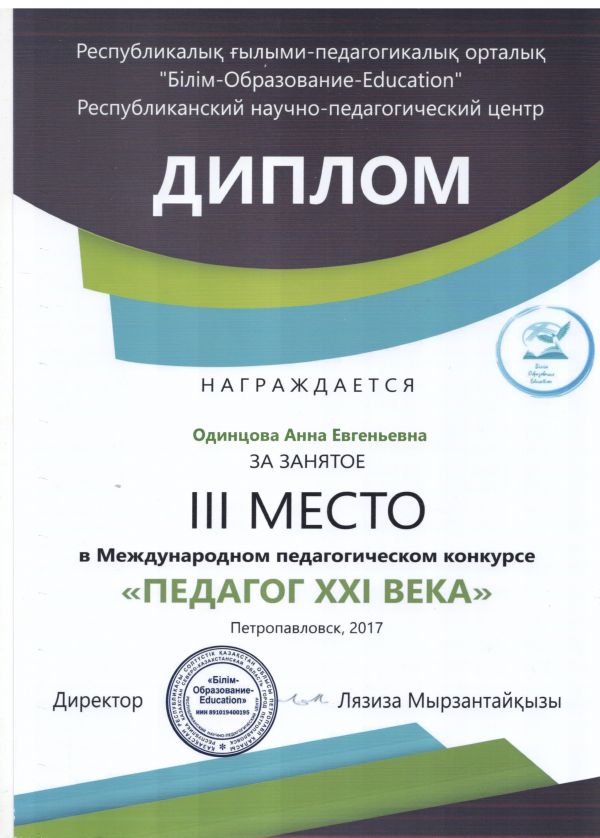 Поздравляем Одинцову Анну Евгеньевну - призера III республиканского научно-педагогического конкурса "Лучшая разработка урока" и Международного педагогического конкурса "Педагог…