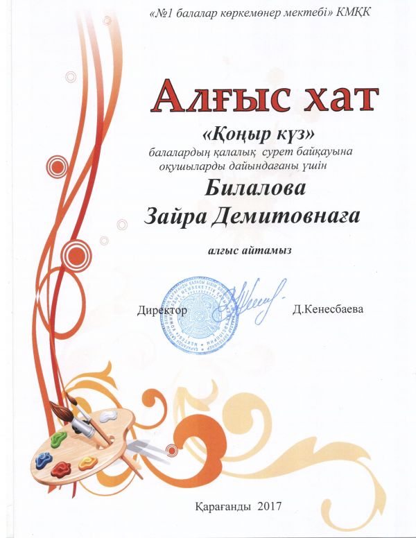 №1 балалар көркемөнер мектебінде өткен "Қоңыр күз" атты қалалық сурет байқауына қатысқаны үшін Бөкенова Дильназ, Болатова Ақбота, Абдраманова Камила сертифи…