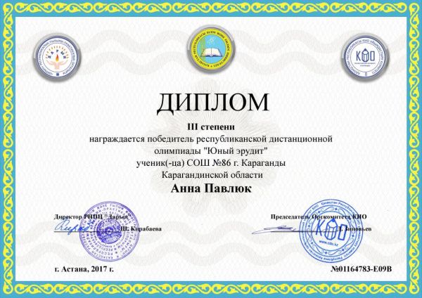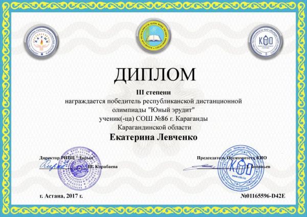 10 сынып оқушысы Тохметова Мадина республикалық олимпидадан жоғары көрсеткіш көрсеткені үшін ІІ дәрежелі дипломмен, ал Домин Никита І дәрежелі дипломмен марапатталды. Пән мұ…