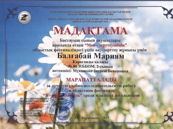 2017 жылдың қазан айында мектебіміздің бастауыш сынып оқушылары облыстық "Мен - зерттеушімін" фестиваліне қатысты.