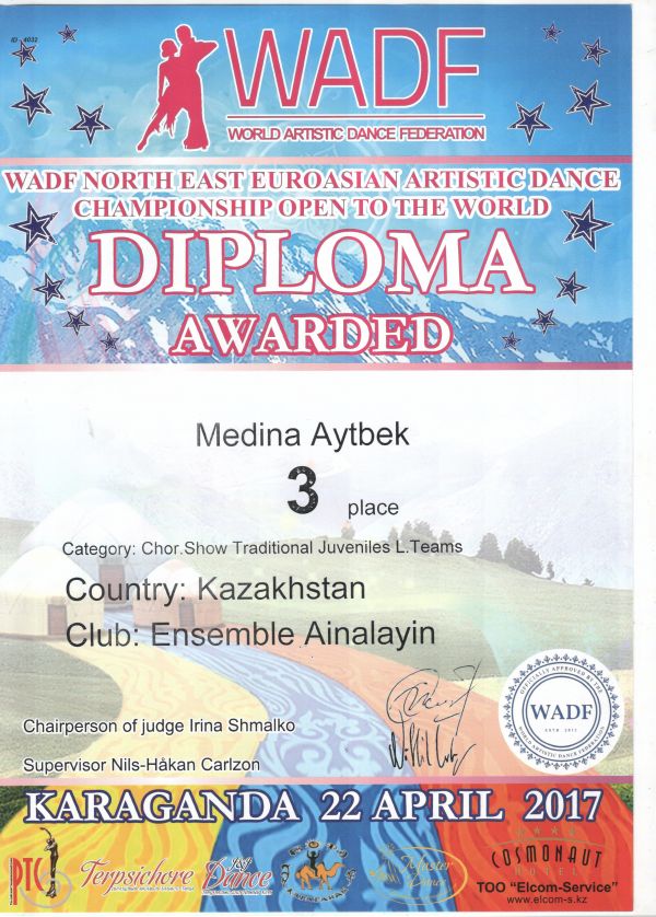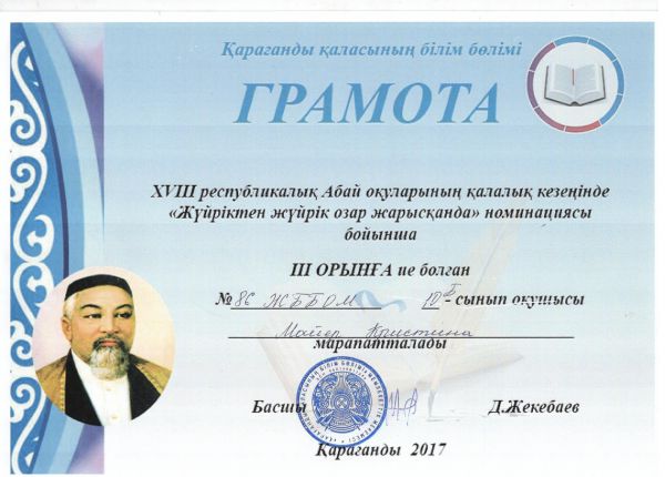 За получения грамоты за занятое III места в городском этапе республиканского Абаевского чтения Майер Кристины награждается ее руководитель Сагиндыковна Багира Санекекызы.