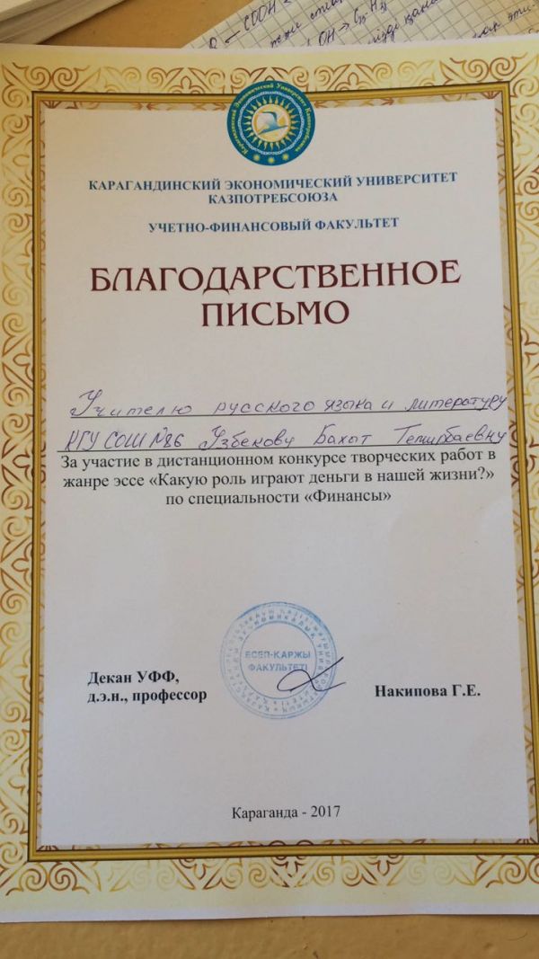 Поздравляем учителя русского языка и литературы Узбекову Б.Т. и ученицу 11«А» класса Аскар Акерке за занятое 3 место в областном конкурсе научных проектов по Кар…