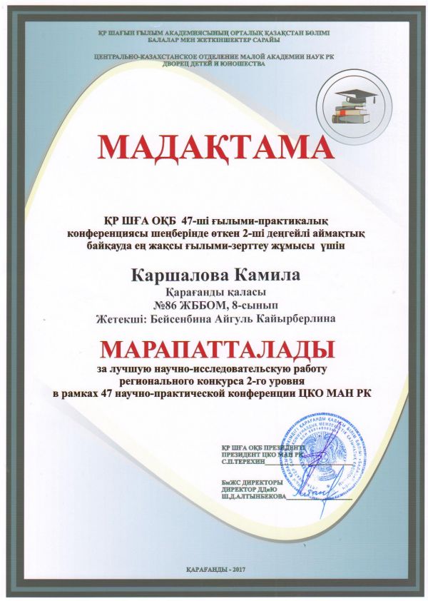 Грамотой за лучшую научно–исследовательскую работу регионального конкурса 2 – го уровня в рамках 47 научно–практической конференции ЦКО МАН РК награждена у…