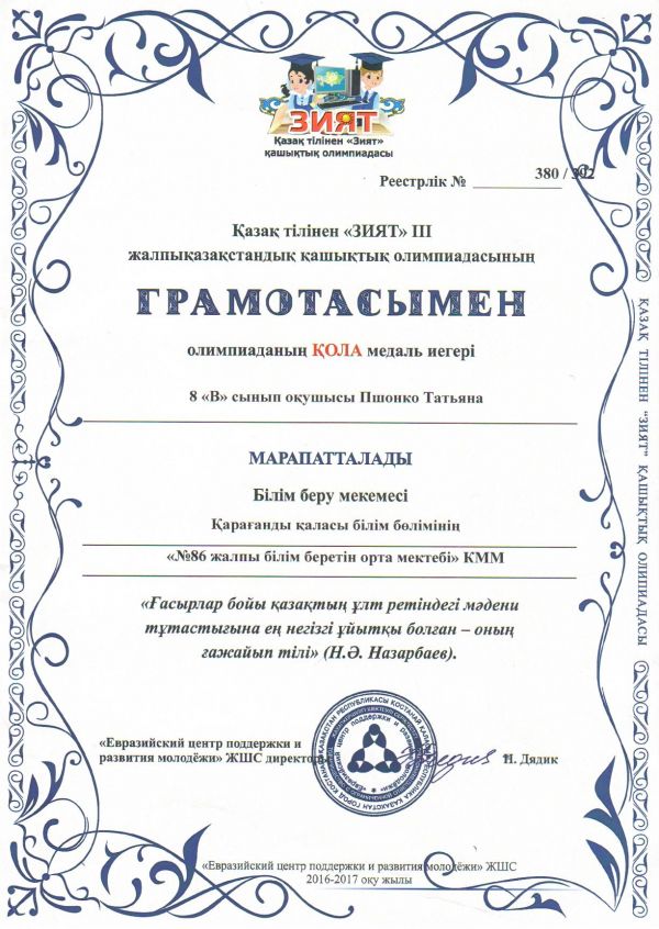 Бронзовой медалью III общеказахстанской дистанционной олимпиады «Зият» по казахскому языку награждена ученица 8 «В» класса Пшонко Татьяна.