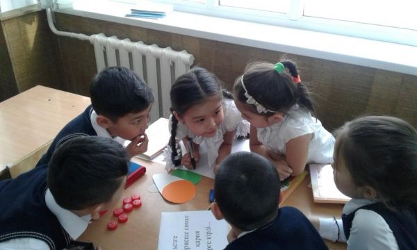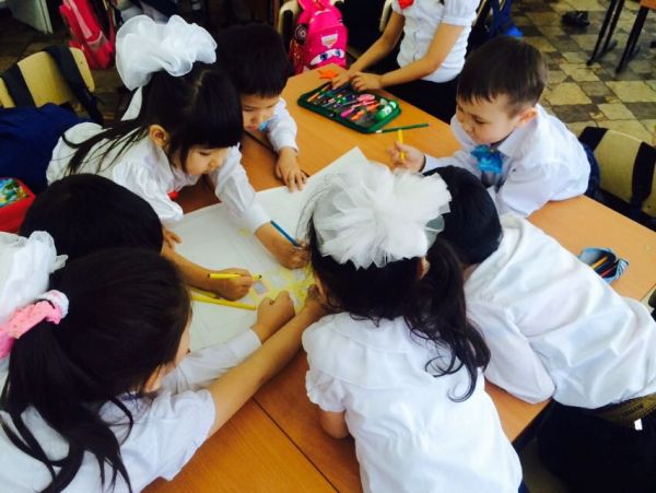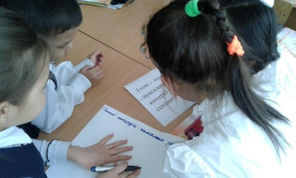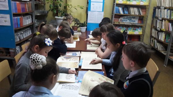3-ші сыныптар  кітапханада қазақ ертегілерін оқуда.