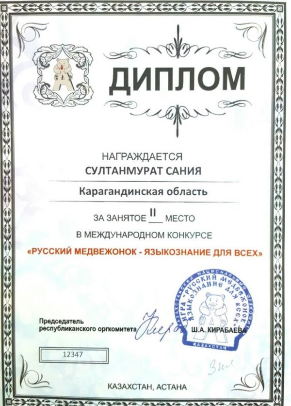 "Русский Медвежонок-языкознание для всех " халықаралық конкурсында 3 "Ə" сынып жетекшісі Касаинова Гульназ Амангельдиновнаның оқушылары Сұлтанмұрат Сания, 2-ор…