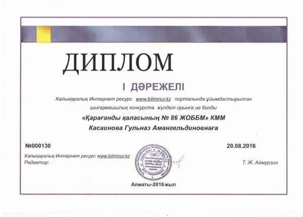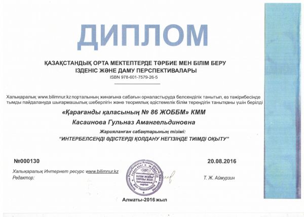 Международный конкурс, организованный интернет-порталом www.bilimnur.kz на тему"Интерактивные технологии,основанные на использовании эффективных методов обучения".В номинации "Лучший…