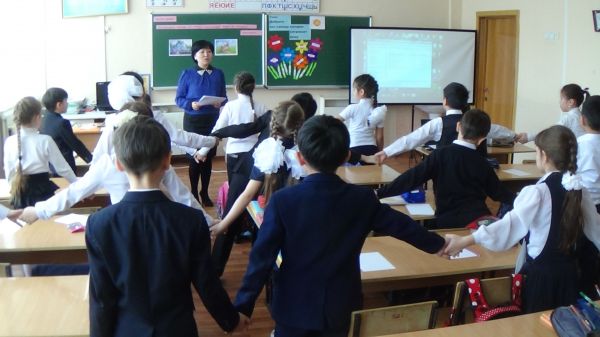 Балалар өз сынып жетекшілерімен бірге "Әлемге күлкі сыйла" тақырыб…