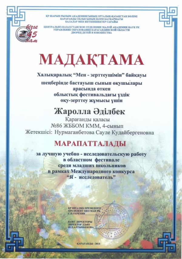 Халықаралық «Мен – зерттеушімін » байқауы шеңберіндегі бастауыш сынып оқушылары арасында өткен облыстық фестивальға белсене қатысқаны үшін Аллаберген Алишер алғыс хатқа ие бо…