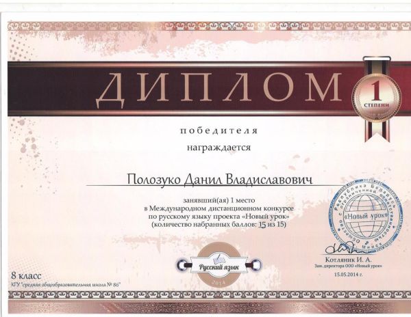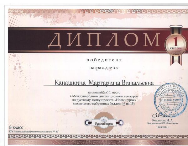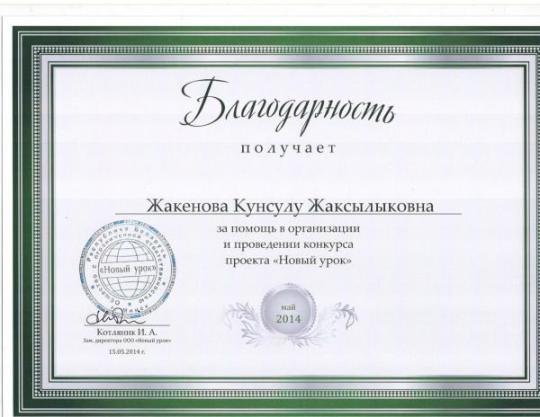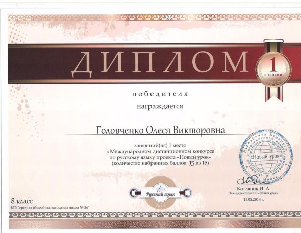 2014 жылдың 5 мамырында 8 сынып оқушылары "Жаңа сабақ"жобасының орыс тілі бойынша Халықаралық қашықтық байқауына қатысты. 1 орын алған конкурстың жеңімпаздары: