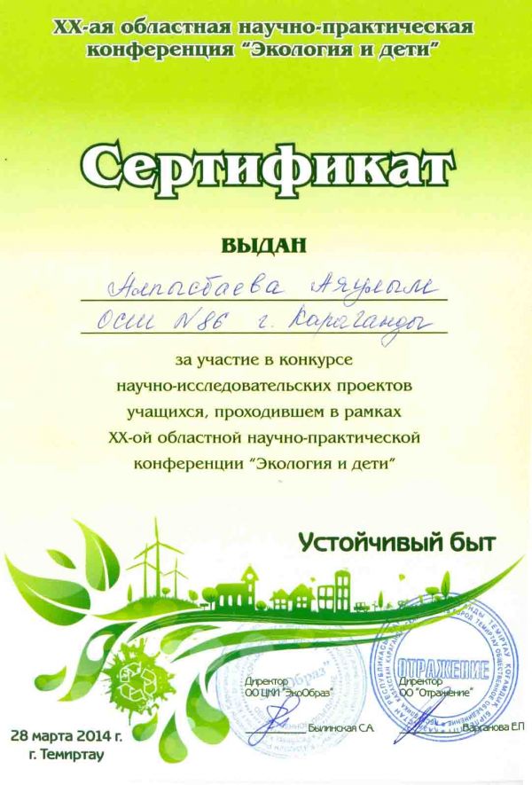 Алпысбаева Аяулым получила сертификат за участие в конкурсе научно-исследовательских проектов учащихся, проходившем в рамках 20 областной научно-практической конференции "Экология и дети".…