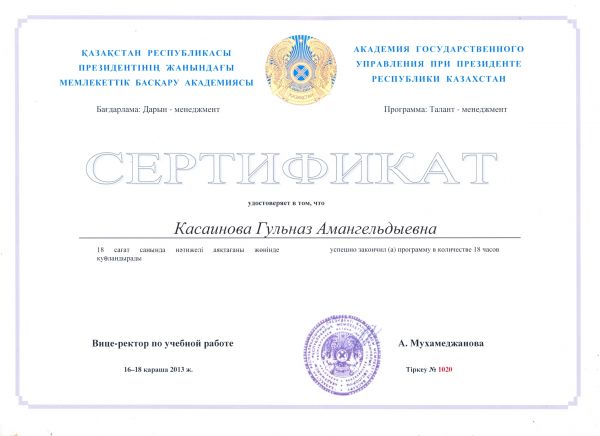 Касаинова Гүлназ Амангелдиевна "Талант-менеджмент" бағдарламасы бойынша сертификат алды.